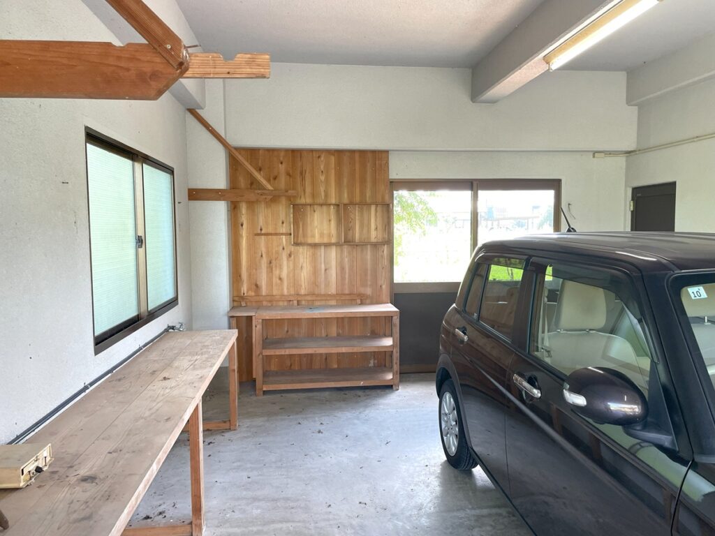 電動シャッター付ガレージに工具置き用の棚が有ります。